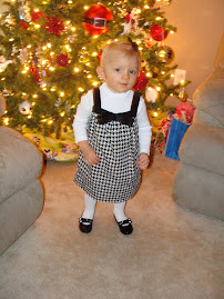 Happy 2008! I will be turning the big 1 year old this year! Big girl! On January 11th, I started to wave and give 5. The very next day I , out of no where, I started to play Peek-A-Boo all by myself (covering and uncovering my own face). I think we played it all day long. On the 21st my first tooth on the top came through, it is my 3rd tooth and it's on the left second one over. I may just be a snaggletooth until the others poke through. They are close! The 23rd I tried to say "Dada" and the 26th I officially said it. The Doc said I would say "Dada and Mama" before I knew what they meant.......but I know exactly what they mean! I may be trying to walk, I pulled up to the recliner today on the 24th. I am very smart, I know how to turn on all of my toy's, move mama's hand off of me when I do not want it there, point to my baby's bow, and can say "Hi". I scoot around on my back and the top of my head to get to where I need to go. I have also become a great little mimick, they just think it is the cutest thing. I like Mickey Mouse.........a lot!I try to get Mama and Dada, like to play with my toy balls, can do splits and hurkey's, and roll my tongue to make different noises. There also has been a few early signs of temper tantrums, hopefully they will disappear, at least that is what my Mommy and Daddy are hoping for. I am still a sweet little princess though!